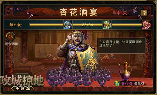 借问酒家何处有 牧童遥指杏花村~在这春天即将到来之际,《攻城掠地》手游中的杏花村大设酒宴,广招各路英雄品正宗杏花酒!已开启武将觉醒功能的玩家才可以参加此次品酒大会。活动期间,玩家每次喝酒都会获得觉醒酒。不过每喝一次酒将会减少一定酒量值,当酒量值为0后就要等酒醒后才能继续喝酒,不同的酒醉意不同。单轮喝酒达到10(奖励觉醒酒10壶)/15(奖励觉醒酒30壶)/25(奖励觉醒酒50壶)杯时,将获得大量额外的觉醒酒奖励。美酒虽好,但也要适量呦~