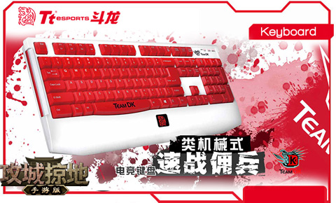 由Tt esports推出的速战佣兵键盘使用类机械式的轴承,同时具备机械式键盘的按键反应,同时较机械式键盘安静及省力。防水特性排水孔可以使玩家的键盘保持乾淨并且使少量水快速排除。按键反应对于那些需要高速操作的游戏来说,玩家可以调节1x—8x按键反映速率来适应更高速的输入。额外一组键盘帽额外一组酷炫红色按键,包含A/S/W/D 上/下/左/右,可依照个人喜好替换搭配。