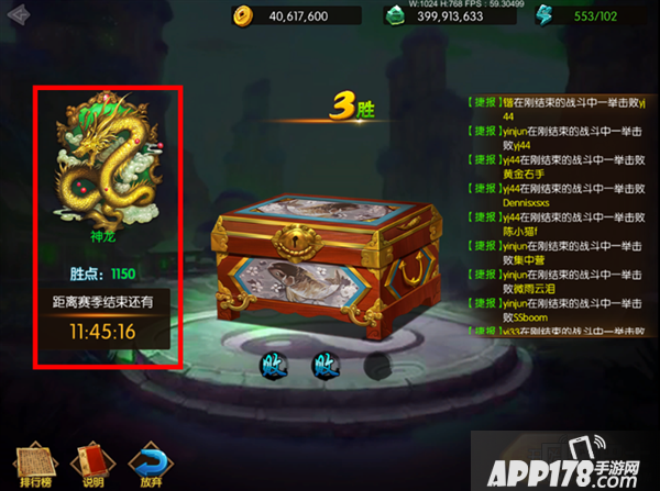 你可以点击左侧的段位勋章了解你在本赛季和上赛季比武场的战绩,本赛季战绩可是会随着你的成长更新的哦。同时,段位勋章下方会显示你当前的积分,以及本赛季的结束时间。