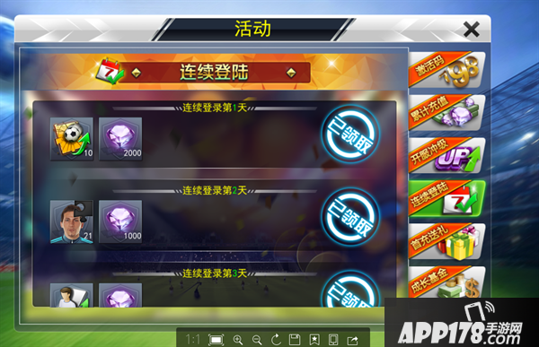 4、各种活动福利:游戏内的活动和各种福利可谓是非常之诱人,签到、登录奖励、首充、等等等等,完成这些活动便能获得大量的球员碎片,轻松加愉快。