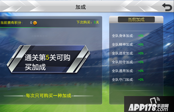 我们每通过5X的关卡就可以购买一次增益buff,这些增益buff包括身体、进攻、防守、精神、守门、通用,而且每一次购买之后这些buff是叠加的。购买这些buff需要的材料则是每一关通关后获得的星级评价。我们可以根据我们的阵型,比如我现在用的阵型是进攻性的阵型,那我可以购买进攻类的增益buff,最大化我的进攻属性。不过需要注意的是这个增益buff的购买有点“霸道”啊,完全是一种“过了这个村,就没这个店”的意思,只要我们关闭了本次的增益buff购买界面,那就买不成了啊,买不成了啊,不成了啊,成了啊,了啊,啊!(本人在玩的时候就手贱点了一次,并没有注意到提示!)