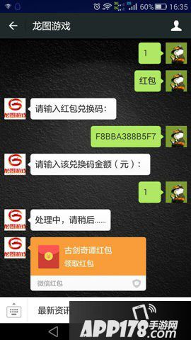 4、关注“龙图游戏”微信公众号,输入【兑换红包】,根据提示输入红包兑换码及相应金额,即可领取微信红包。