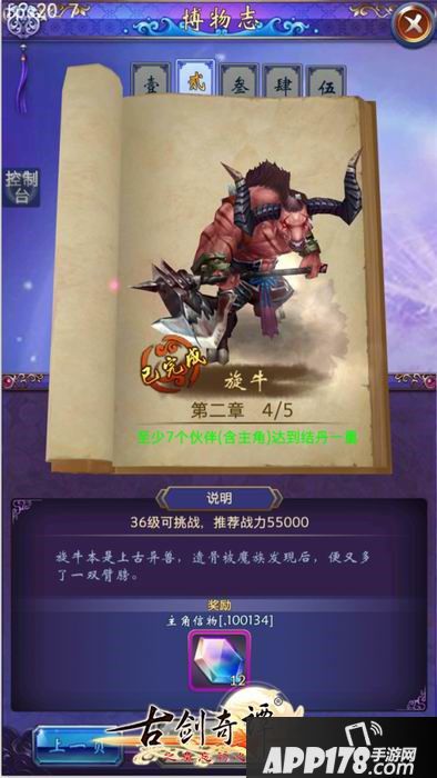 本关开启条件是玩家有7名伙伴达到结丹一重境界,且主角等级需要达到36级。旋牛的普通攻击为单体物理伤害。技能有两种,其一是单体重击,造成大量物理伤害;其二为全体多段物理攻击,会对全体伙伴造成多次大量物理伤害,对于物防较低的伙伴而言,甚至可以一击必杀。旋牛还会对伙伴造成状态伤害,十分强悍。