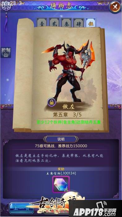 本关的开启条件是玩家至少有12名伙伴达到结丹五重境界,且主角等级达到75级。傲左以强力的全体物理攻击和状态攻击为主。胜利后可获得25个主角信物。