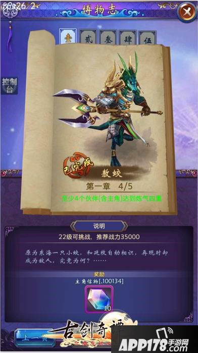 本关开启条件是玩家至少有4名伙伴达到炼气四重境界,且主角等级达到22级才可以挑战。敖蛟主要以强力的物理攻击为主,有单体攻击和群体攻击,对角色的物理防御要求较高。胜利后可以获得10个主角信物,用于升级主角的觉醒。