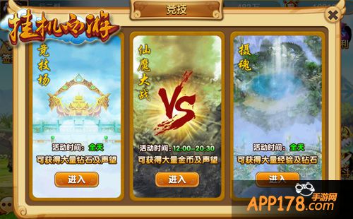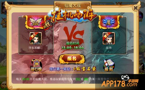 仙魔自古势不两立,相杀千年。《挂机西游》每日的仙魔大战于每晚八点开始,而玩家们可在12点后便进行报名参与其中,将会被随机分配到或仙或魔的族系阵营,一念成魔,一念成仙,全凭个人思量。成功加入阵营后,系统会根据玩家自身战力随机与对立阵营进行1V1、2V2、3V3的竞技对决。每成功击杀对立阵营一名玩家,便能获取5个精魄,最终由阵营玩家所获精魄总数,来判定此轮仙魔大战的胜利方。为了阵营荣誉,勇敢奋战吧!
