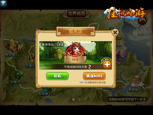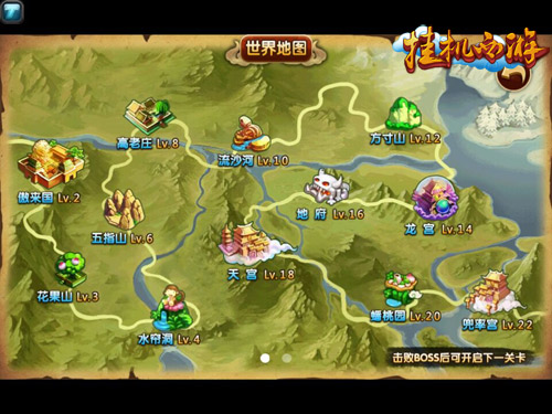 当玩家等级达到2级时,就可以进入世界地图的第一个地方—傲来国,玩家在傲来国击败这里的boss,便可开启进入下一个关卡,同样也需达到相应的等级,走进花果山、水帘洞、五指山、高老庄等充满神秘和探索欲的地方。提高你的等级和战斗力便可以看到更多不同的世界。