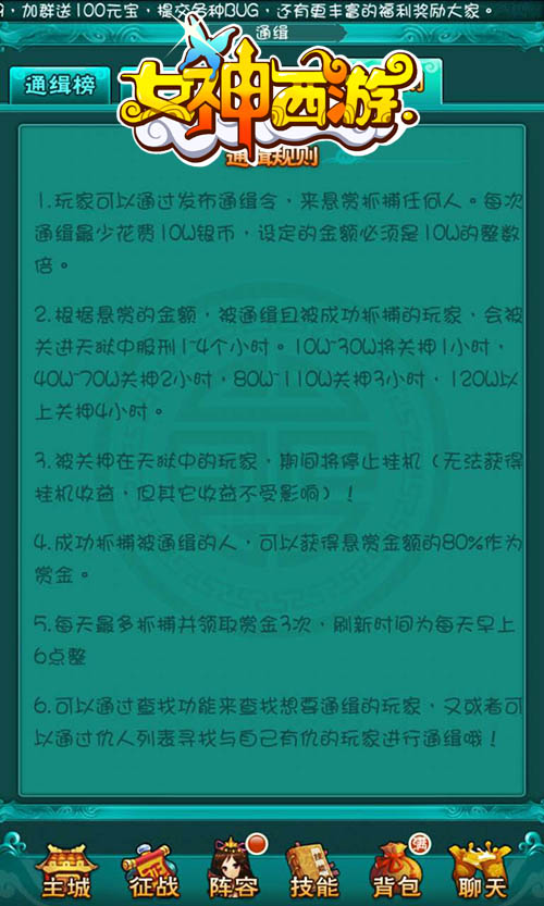 在游戏中,难免被人欺负,要报仇就不必藏着掖着,游戏世界本就该快意恩仇!《女神西游》就是这样一个爽快的世界,玩家开放罪仙录系统,哪一个惹你不痛快,发布通缉令,只需些许银两,就能坐着看全世界的人在追杀他,让他尝一尝牢狱之苦!只是人在江湖飘,怎能不挨刀,如果你也被别人追杀,“享受”牢狱之灾时,莫慌,只需花费悬赏金额150%即可直接出狱。俗话说有钱能使鬼推磨,一点都不错!
