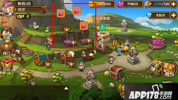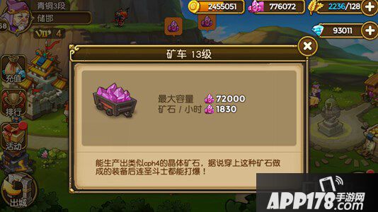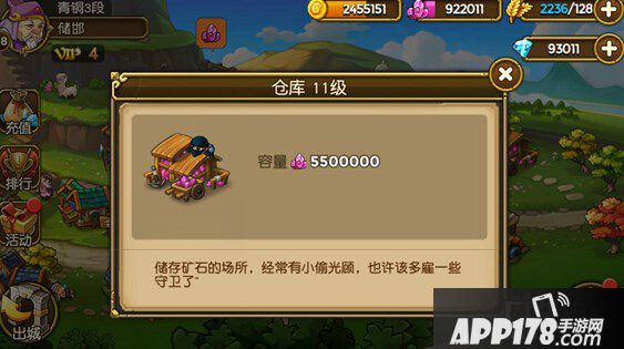同时,主公也需要注意,矿石的产出也会有上限限制,到达存储上限后,就无法再收集矿石了。主公可以通过升级最右侧的仓库来提升矿石的存储上限。