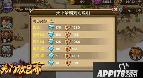 首先,在世界大地图左侧的“排行”里,可以查阅到即时的榜上信息,为诸位的近期目标奖励做好冲刺准备。排名奖励是在每天的20:30结算,21:00通过邮箱发放。除上图列出的奖励分配外,全服51-200名仅有军需奖励,而201名之外就啥都木有了。