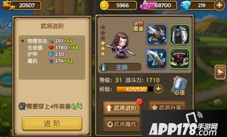 当武将装备齐全时,点开“武将进阶”可以为武将进阶,在左侧的面板中可以看到武将当前三围和进阶的数值及技能变化。武将进阶是提高武将战斗力的重要途径之一哦!