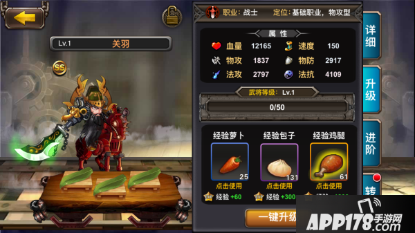 武将的升级需要给武将们手动喂食鸡腿、包子、胡萝卜。选择【阵容】-【武将】-【升级】即可进入升级界面。玩家可选择单次升级,也可以一键升级,武将等级提升后将会带来属性的提升。
