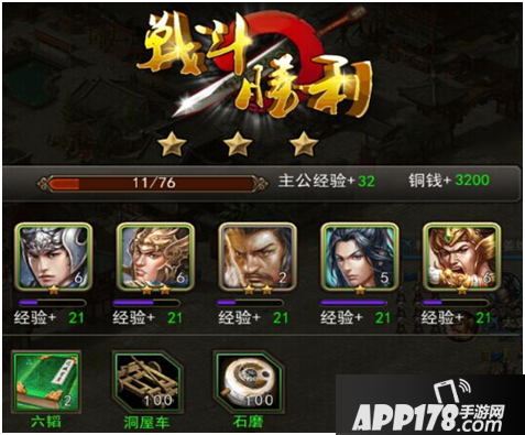 攻城战斗胜利后可获得丰厚的奖励,比如主公和武将的经验值,铜钱,道具等,是提高士气,激发战斗欲望与升级的不二选择。
