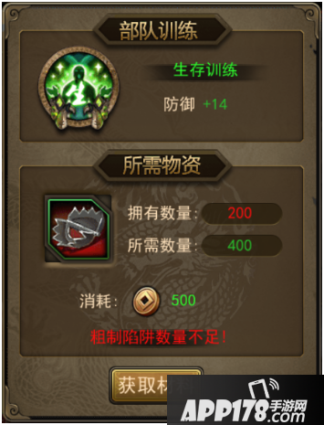 在部队训练界面,当所需物资不足时,对应训练内容图标为灰色(有【未训练】字样),点击该图标,可查看该训练内容所需物资。