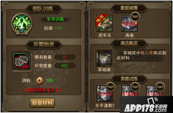 公欲行攻城略地、称霸一方之事,必先练其师。部队训练消耗训练材料,不同训练材料对应不同的兵种和训练内容,为提升部队综合实力,应尽可能多地获取各类材料。那么,如何获取所需的训练材料呢?
