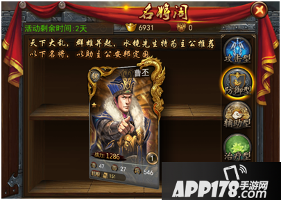 名将阁中可召唤的武将,有攻击型,防御型,辅助型,治疗型四大类。玩家可根据自己的实际需求选择武将。