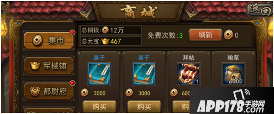 在【拜访】界面可查看当前拥有武将将魂数量与拜帖数量,拜帖不足时,可以到【商城】中的【集市】购