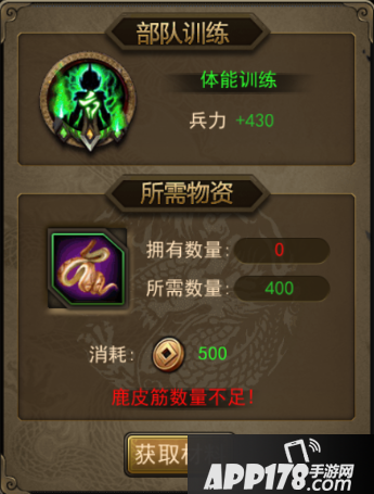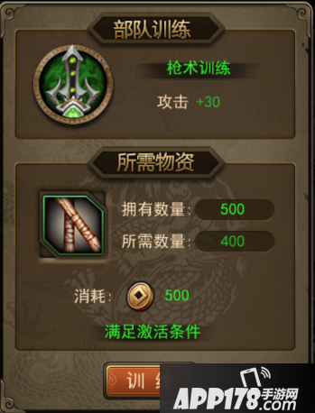 以枪兵属性武将为例为例,在主界面点击【武将】,选取武将后即可进入部队训练界面。分为枪术训练,抗打训练,体能训练三部分。