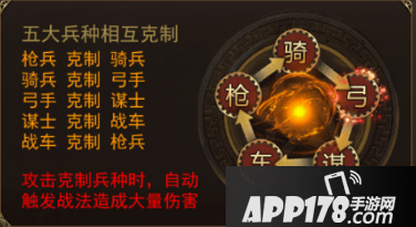游戏中共有五大兵种,并相互克制。枪兵可以杀伤战马,克制骑兵。骑兵冲锋克制弓手。弓手的射程克制后排谋士。谋士克制无脑的战车。而战车又克制前排的枪兵。