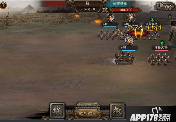 进入城战后,玩家可选择攻方/守方,派遣部队,每只部队由5个武将组成