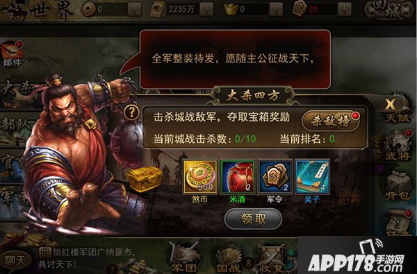 2. 根据参战玩家的杀敌数量对玩家发放单人奖励,奖励资源为:军资、功勋、铜钱、主角经验