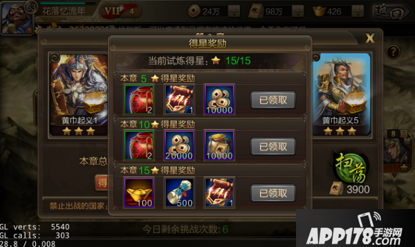 当通关得星数达到5、10、15时,还可以在得星奖励中领取奖励。