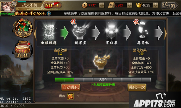 点击界面下方的强化按钮,可进行宝物强化。强化宝物需消耗铜雀令,每成功强化一次均会提升强化进度。强化进度每达成一个刻度,即可获得属性提升。