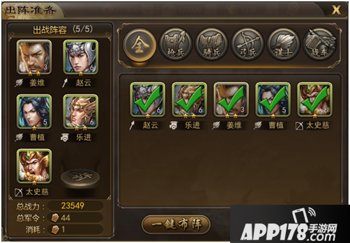 值得一提的是,一定要勾选上兵种和数量尽可能多的武将,并根据各个武将的兵种排好阵势。当然,比较懒的玩家也可以直接点击【一键布阵】啦。像上面这样不仅兵种齐全,而且能提高总战力,以便在沙场上见招拆招,所向披靡!