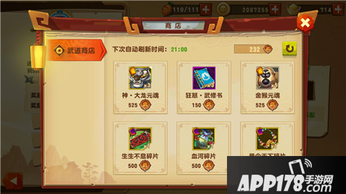 说明,武道商店有三种碎片,分别是生生不息(五十级)、血流成河(四十级)、号令天下(三十级)。大家不要去买紫色武修书。每天购买一个,一个月不到都足够了三个金色武器。