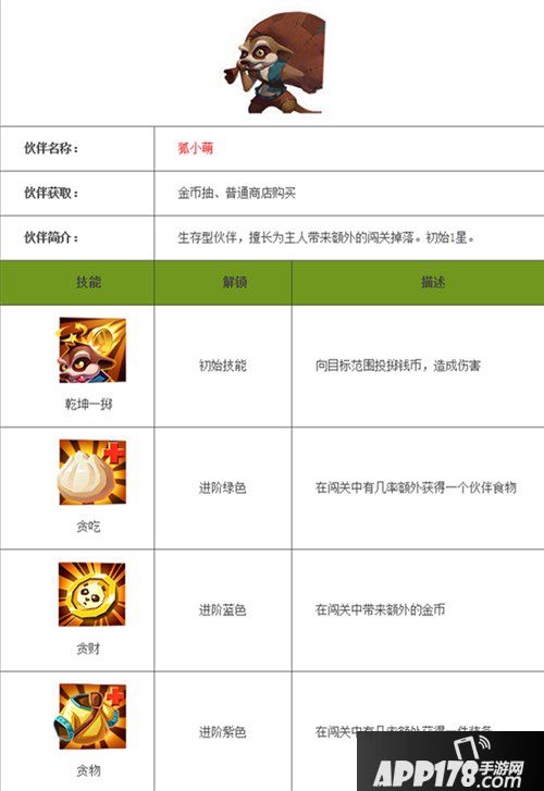 狐小萌是功夫熊猫3手游里的生存型伙伴,擅长为主人带来额外的闯关掉落。