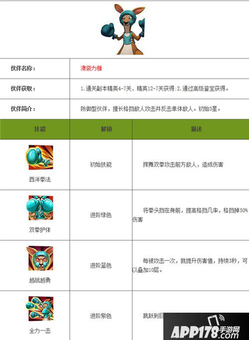 澳袋力雅是功夫熊猫3手游里的防御型伙伴,擅长格挡敌人攻击并反击单体敌人。
