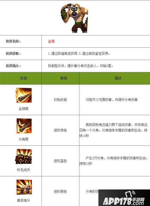金猴是功夫熊猫3手游里的防御型伙伴,擅长靠分身攻击敌人。