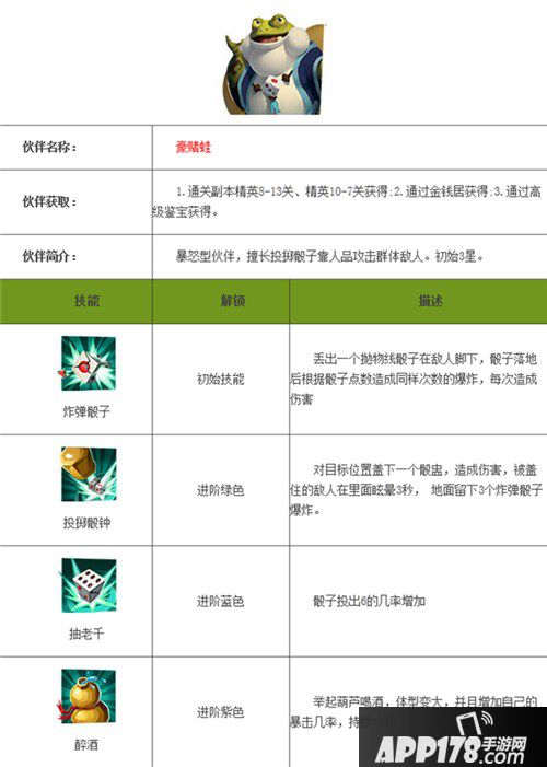 豪赌蛙是功夫熊猫3手游里的暴怒型伙伴,擅长投掷骰子靠人品攻击群体敌人。