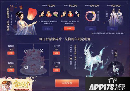 周年好礼不仅于此,小主们还会收到额外的惊喜。每日祈愿时有一定概率掉落蛋糕碎片,集齐4片碎片即可兑换仙气飘飘的萌宠“夫诸”一只,与你一“鹿”相随。活动期间内,蛋糕碎片可赠送、可索要,快与你的小伙伴一起快速get同款跟宠吧!