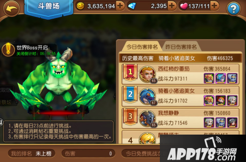 世界Boss每天可以免费挑战一次,如果你对自己挑战的伤害值不满意,可以购买挑战次数。系统会自动记录最高一次的伤害值来进行当天的伤害值排名。这里还是推荐一些在世界Boss战中非常好用的英雄:剑圣绝对的高输出、小红帽的技能在这里也非常牛、作为奶妈的小牧也是非常尽心尽力的。手动达人的你可以试试看,新记录等你来创造,我等手残党还是用自动方式,慢慢堆战力吧。
