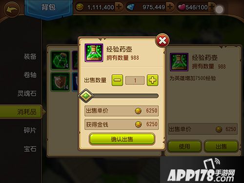 背包里的物品对应可装备的英雄、该物品获得的途径、可合成什么物品都能在物品详情中找到,方便各路英豪查看。想让角色升级或者增长体力,就去消耗品选项中查看。而经验药水可以直接在背包里使用,点击弹出角色头像界面,可直接加经验,相当方便快捷。