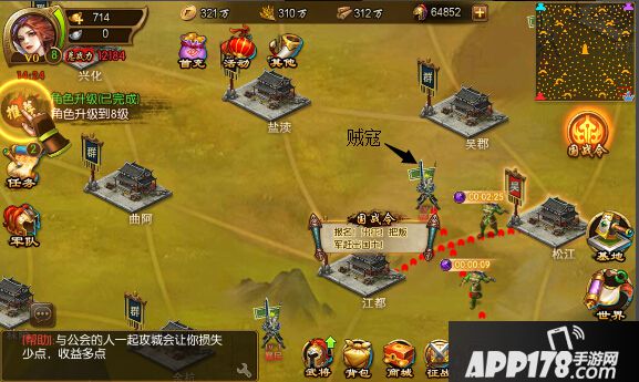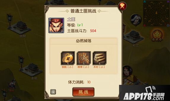 进入世界地图,散布在城池之间的人就是暴民或者贼寇了!点击就可以查看该暴民贼寇的等级、战斗情况,以及成功围剿后可以获得的物品报酬。