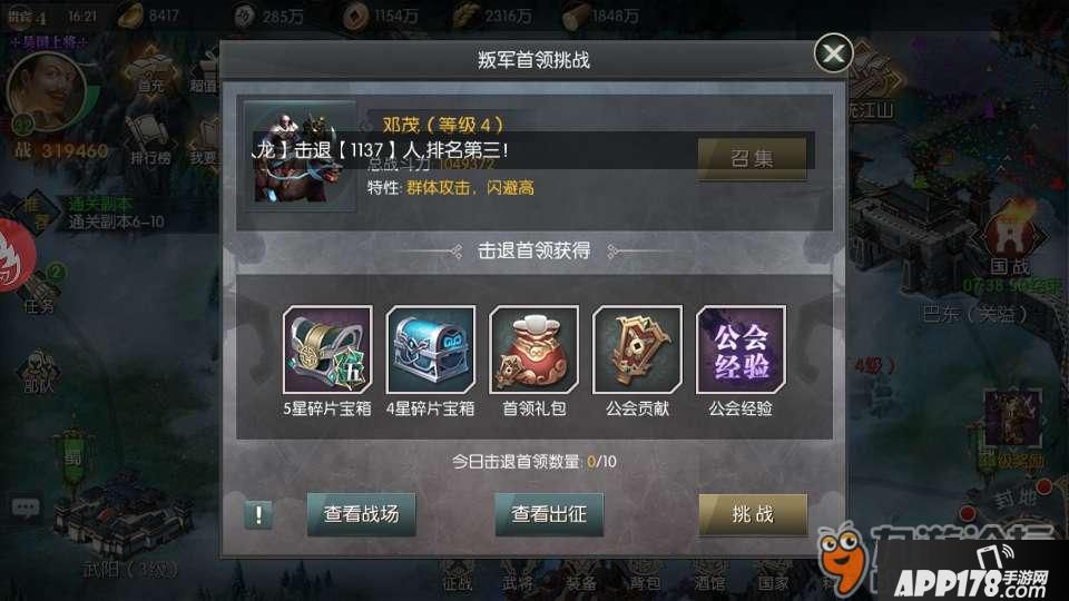 然后打叛军首领,这里需要量力而行,找自己能打过的首领进行挑战,可以获得工会经验与工会贡献,工会贡献可在工会商店兑换大量资源,更有五星碎片宝箱可掉落。