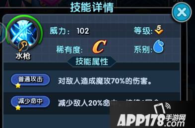 天赋技能:水枪---对敌人造成魔攻70%的伤害并使敌人的命中降低