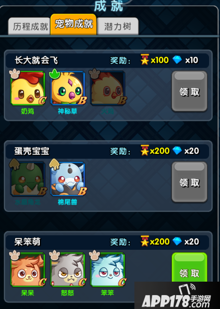 成就分为历程成就、宠物成就两种,历程成就以在游戏中的行为内容为主,宠物成就则是以收集的宠物信息为主,满足不同训练师进行挑战。