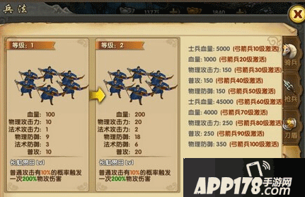 武将装备部位可以镶嵌神兵道具,每个部位可镶嵌5种神兵。神兵道具可以升级,升级后对应神兵的属性会得到提升。