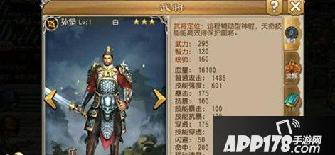 孙坚:破虏雄才略,忠烈为先锋。远程辅助型神射,天命技能可以高效得保护副将。