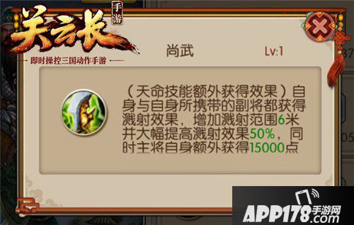关羽化神后获得化神技能“尚武”,技能特效:(天命技能额外获得效果)自身与自身所携带的副将都获得溅射效果,增加溅射范围6米并大幅提高溅射效果50%,同时主将自身额外获得15000点普攻穿透值,持续8秒。