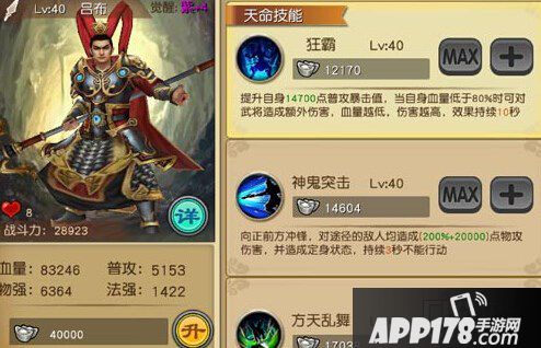 天命技能狂霸,提高自身普攻,并对血量低的敌人有额外伤害。