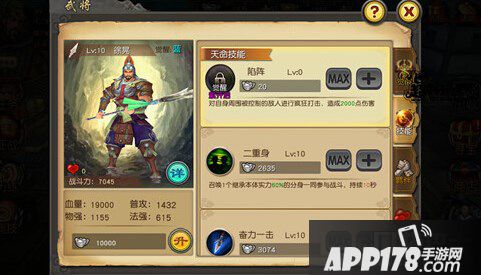 同样,武将等级提升之后,也可以通过银两对技能进行升级,天命技能需要武将决定到紫色才能获取学习。