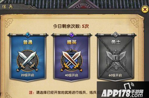 玩家每天可以参加2次练兵场活动,练兵场中可以获得大量武将经验。练兵场中会不停的刷出怪物,消灭所有怪物即完成活动,进行练兵场活动的时候适合携带有AOE技能的武将。