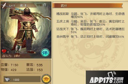 小编点评:张飞的羁绊明显就是为了张飞作为坦克武将冲锋陷阵设计的。生命、物理防御、法术防御、闪避都增加50%。简直屌爆了,张飞这个坦克冲入敌阵可以吸引大量的伤害为其他人的输出做出极大的贡献。