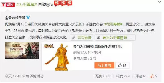 自7月10日起《关云长》手游“为羽筹模 再塑忠义”众筹活动正式启动!7月28日,《关云长》手游公测当天,实际下载用户达到1000万人,官方将斥资打造同等价值的“关公金像”一尊。