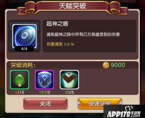 防御天赋超神之盾升阶绿色天赋需消耗15个低阶突破石,2个防御天赋之盾,5个布衣。升阶需花费9000金币。天赋超神之盾是横冲直撞中的高阶天赋,通过提升超神之盾的品阶可以减免超神之路玩法中友方所有角色所受伤害量。