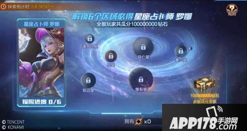 大大们可以在地图中选择已探索完成的星球,和全服战士们一同瓜分那颗星球上的宝藏。本次每人最多可获得钻石*500哟~另外,探索全部6个区域,还可以解锁星座占卜师罗娜的皮肤哦!